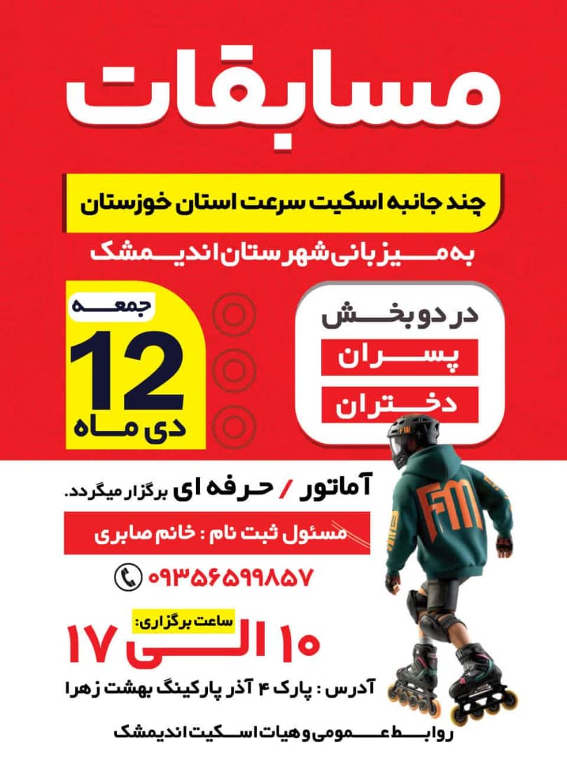 مسابقات چندجانبه اسکیت استان خوزستان به میزبانی اندیمشک برگزار شد مسابقات چندجانبه اسکیت استان خوزستان با حضور ۱۲۰ ورزشکار از شهرهای...